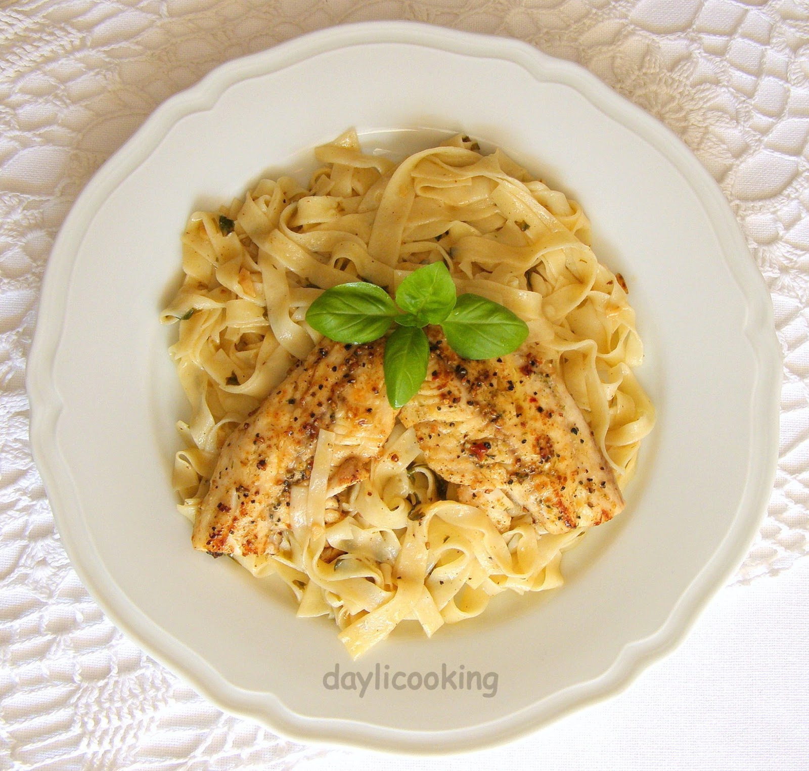 Makaron w sosie cytrynowo – bazyliowym z filetem z tilapii czerwonej
