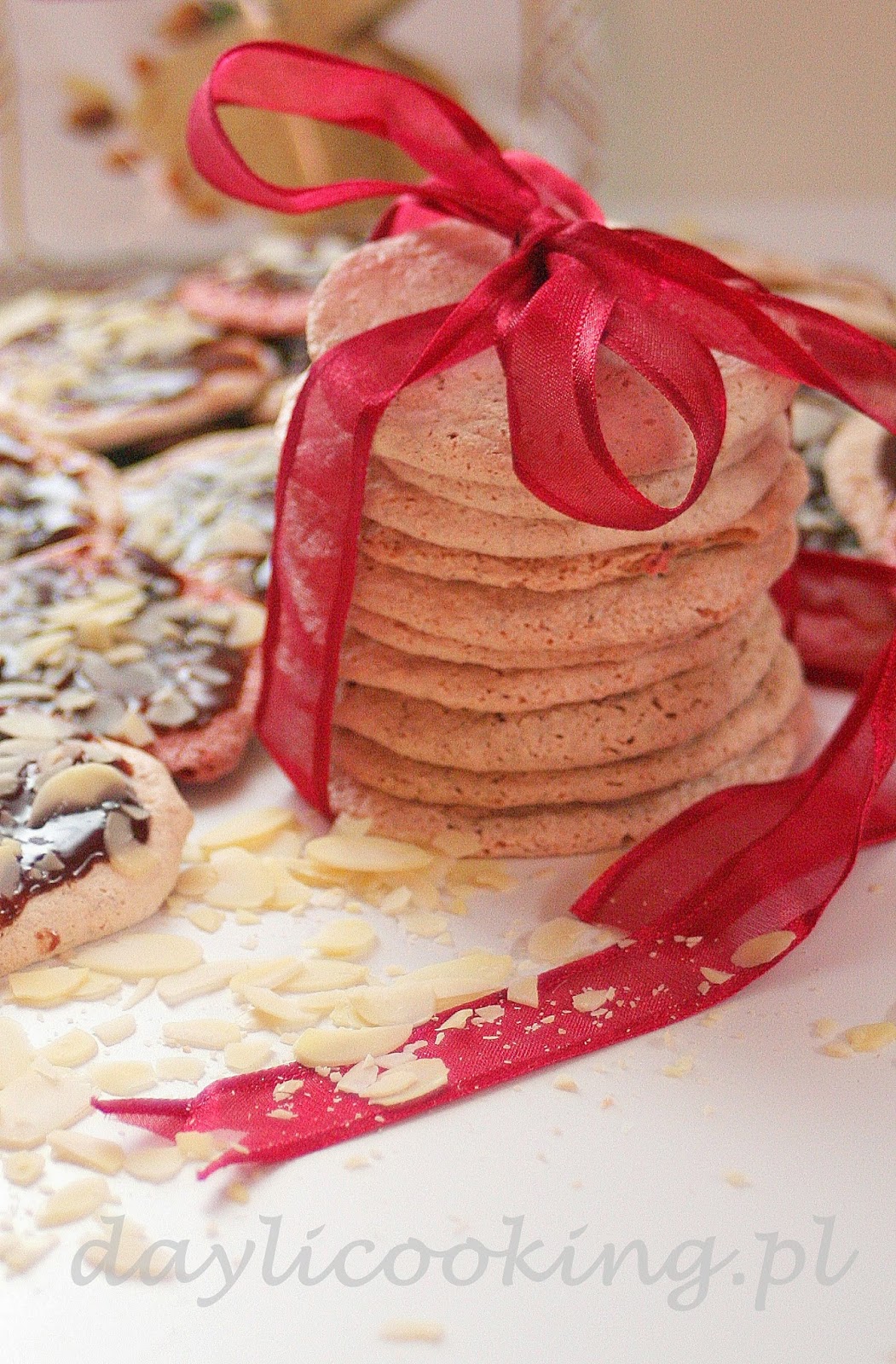 Część ciasteczek lekko oblałam polewą czekoladową i obsypałam płatkami migdałowymi. Resztę schrupaliśmy bez dodatków.