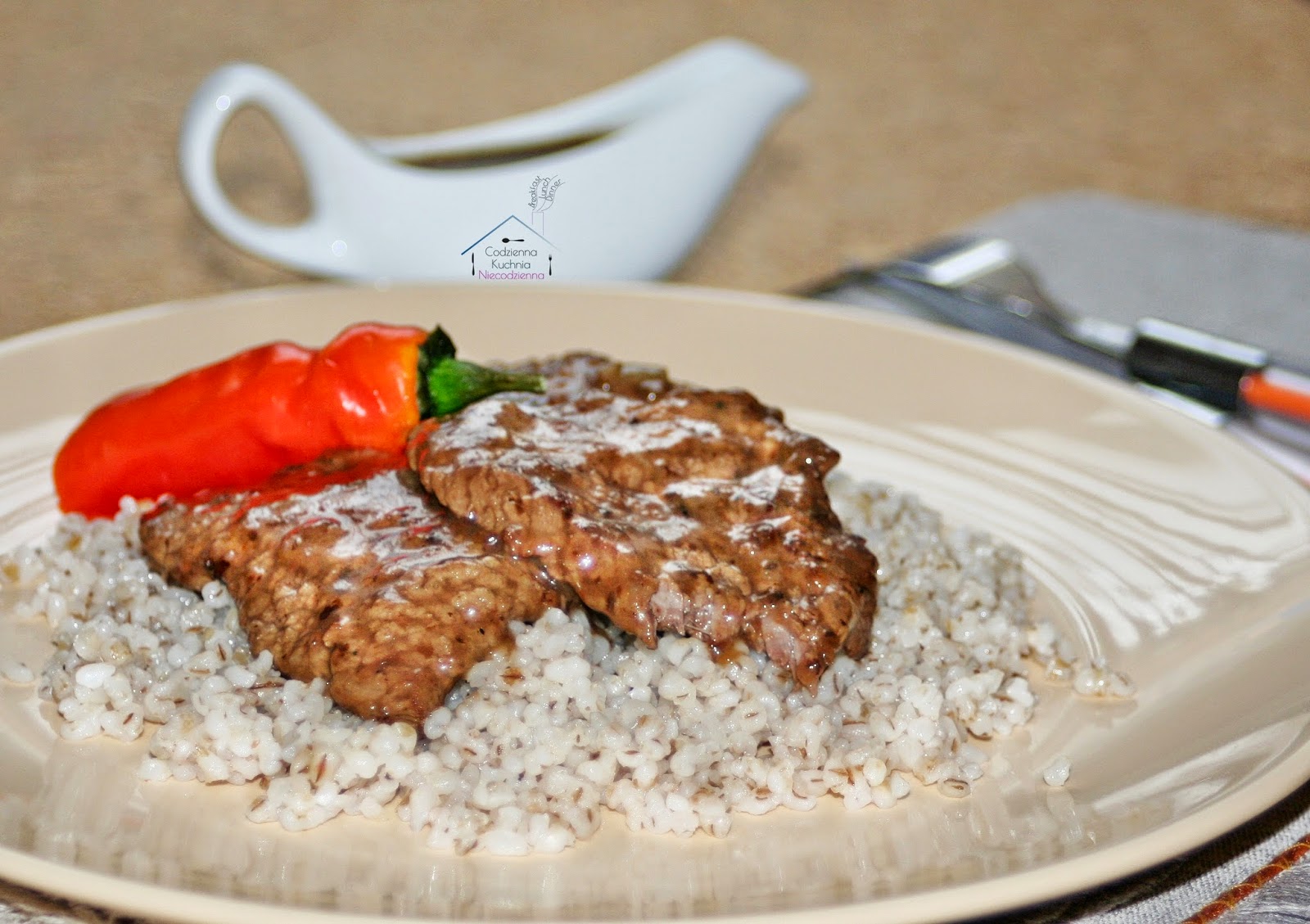 Wielbiciele gęstych i zawiesistych sosów mogą lekko go zagęścić mąką i doprawić śmietaną. Ja dzisiaj jednak nie zagęszczałam swojego sosu i nie dodawałam śmietany. Bitki podałam z kaszą jęczmienną ugotowaną na sypko. Jako dodatek wspaniale smakuje surówka z kiszonej kapusty lub marynowana papryka.