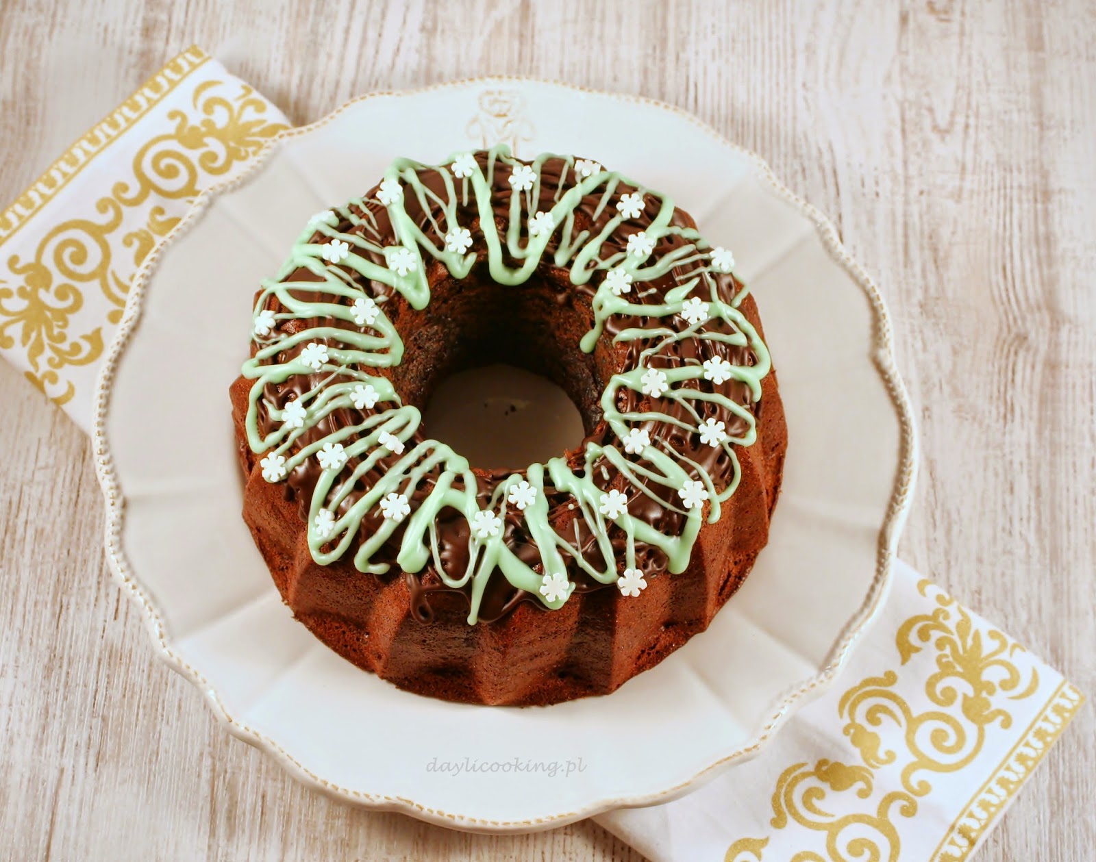 Wystudzone ciasto polać polewą. Ja użyłam polewy czekoladowej i kolorowego lukru.