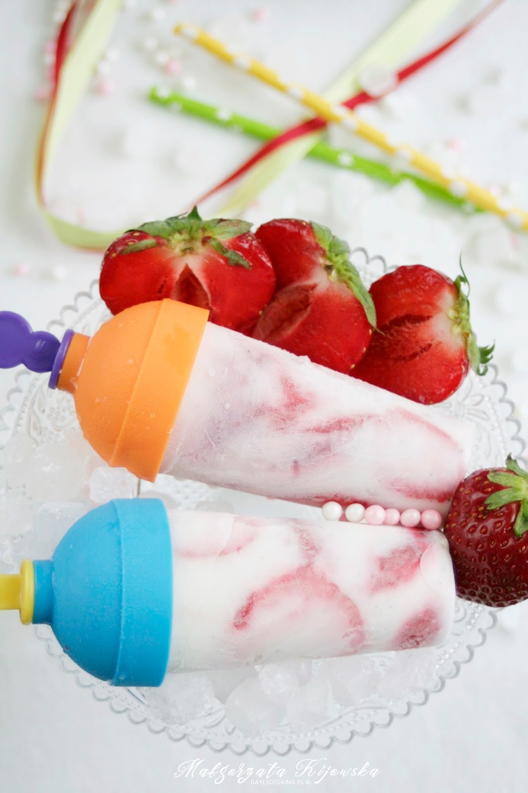 Truskawki ułożyć w pojemniczkach do lodów, zalać jogurtem. Zamrozić w zamrażarce.
