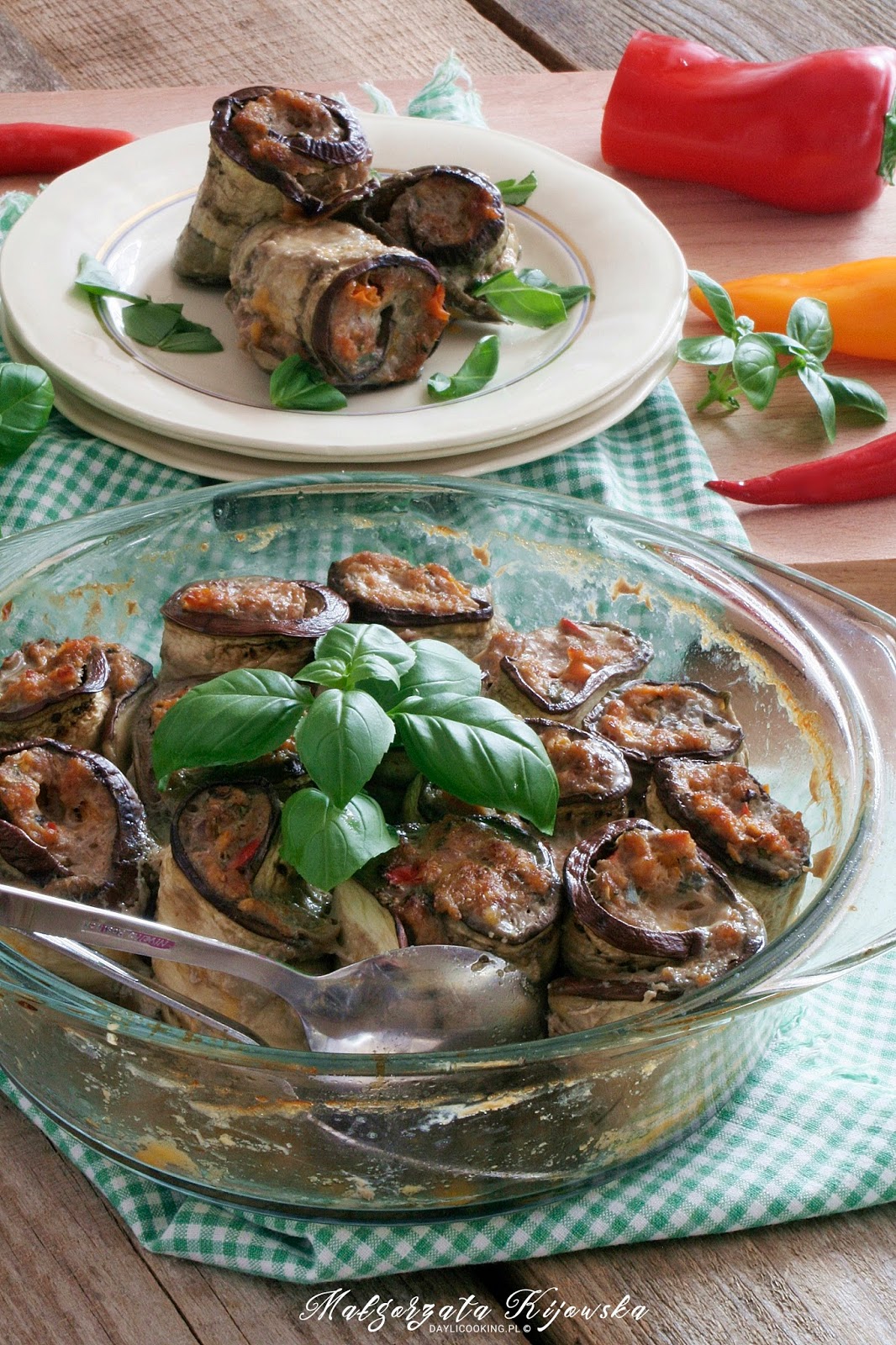 Każdy plaster bakłażana dokładnie osuszyć papierowym ręcznikiem lub czystą ściereczką. Na całą długość osuszonego plastra bakłażana nakładać masę mięsną na grubość około 1 cm. Każdy plaster zwijać i układać na sztorc w wysmarowanej olejem formie.