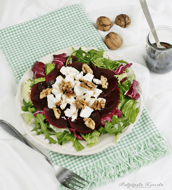 Na talerzyku lub półmisku ułożyć sałaty. Na nich plastry buraka, ser feta i uprażone orzechy. Całość skropić sosem: ocet balsamiczny wymieszać z solą i pieprzem, a następnie połączyć z oliwą.