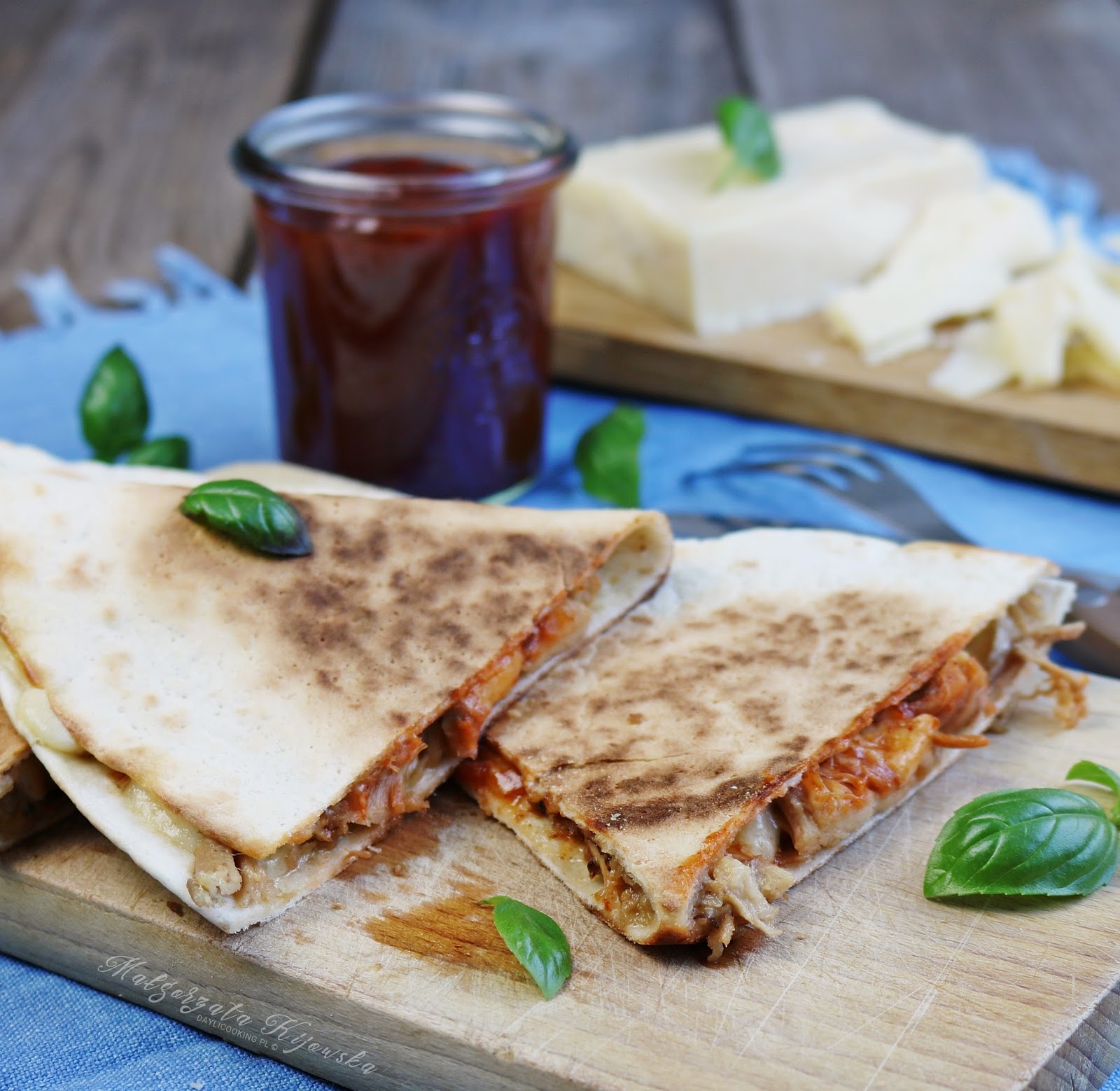 Quesadilla to danie z kuchni meksykańskiej. Jest to, najogólniej mówiąc, opiekana kukurydziana lub pszenna tortilla z farszem: serem, ziemniakami, grzybami, mięsem, papryka czy chorizo. Odmian quesadilli jest mnóstwo i myślę, że trudno byłoby znaleźć jedyną i słuszną. Pamiętacie przepis na łopatkę wieprzową długo pieczoną? Dzisiaj chcę Wam pokazać jak można ją wykorzystać oprócz podawania jej z bułką czy na kanapkach.  Wykorzystując sporą ilość rwanej wieprzowiny przygotowałam właśnie taką quesadillę. Dodatek sosu barbecue i sera cheddar cudownie podkręcił smak. Nie bójcie się przygotować więcej tego przysmaku. Quesadillę można jeść również na zimno lub zawiniętą w papier do pieczenia odgrzać w piekarniku.